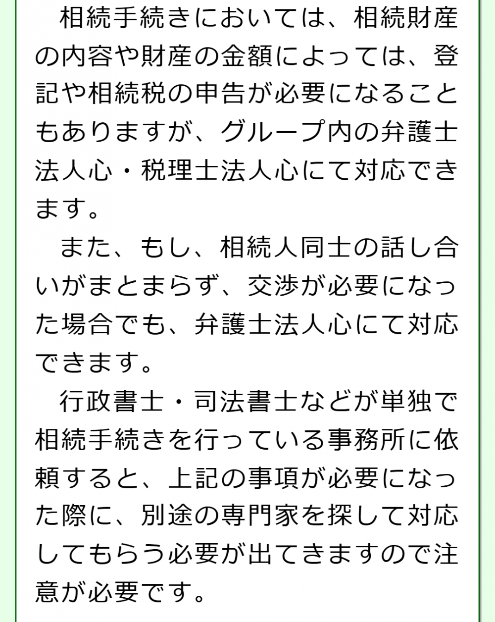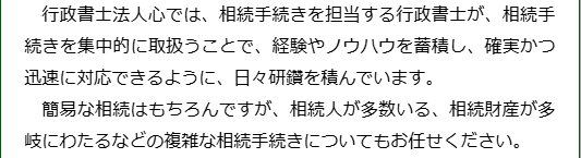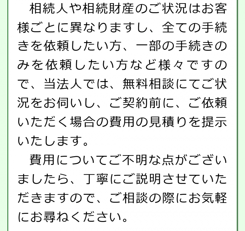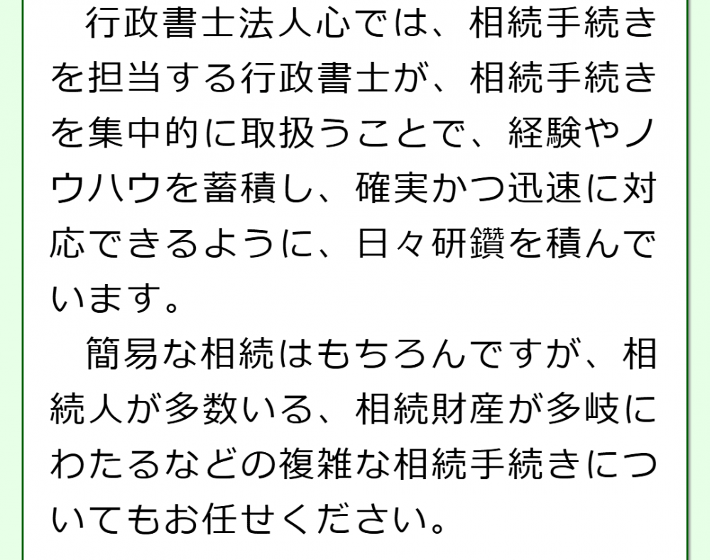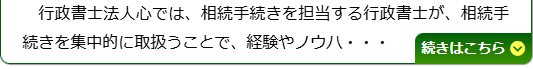 当法人では、日頃から相続手続きを集中的に取り扱っている行政書士が対応しますので、安心してご相談いただければと思います。
