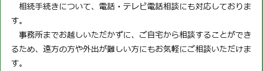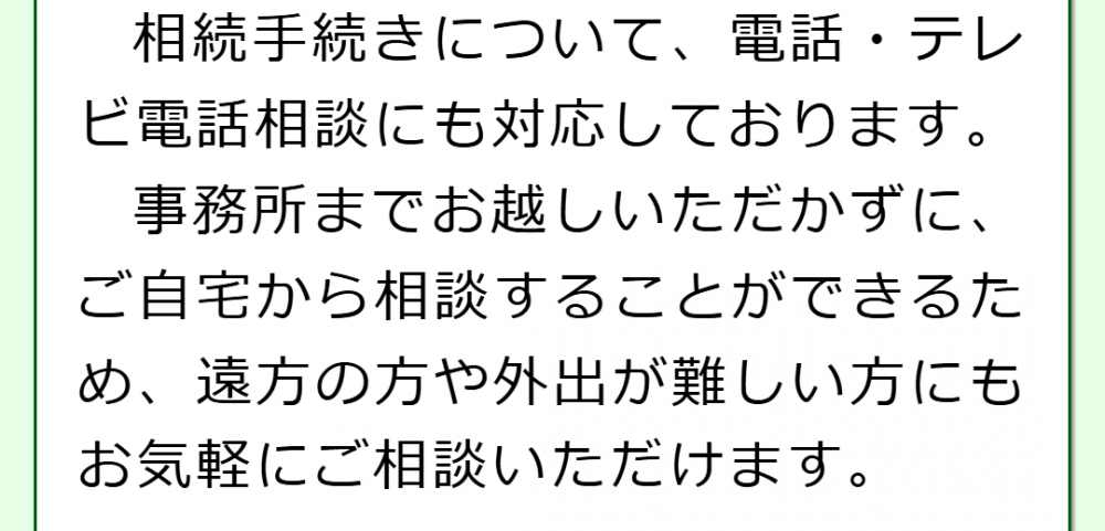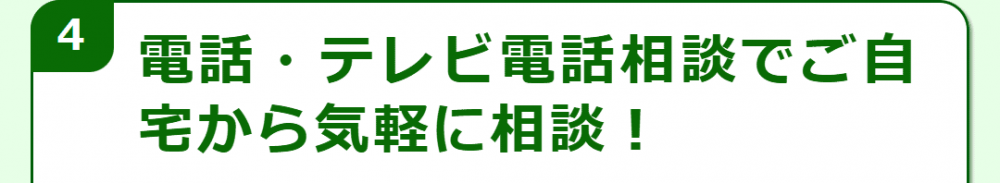 最寄り駅から近い場所に事務所があり相談にお越しいただきやすい環境に加え、電話やテレビ電話を使ってご相談いただくこともできます。