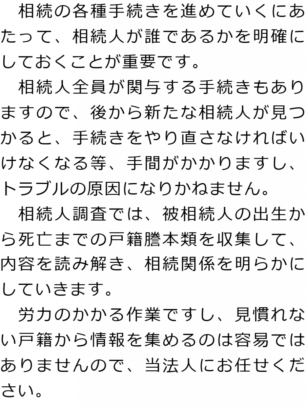 トップ業務内容相続人調査 階層構造▼ 業務内容(目次) 相続人調査 業務内容(目次)業務内容トップ行政書士法人心の業務内容遺言遺産整理相続人調査相続財産調査遺産分割協議書の作成預金・貯金の解約・名義変更証券口座の解約・名義変更自動車の名義変更心グループのその他の業務内容家族信託・民事信託節税対策事業承継遺言の検認相続放棄限定承認遺産分割遺留分侵害額請求相続登記相続税申告相続税調査 受付時間 平日 9時~21時、土日祝 9時~18時 夜間・土日祝の相談も対応します (要予約) 所在地 〒192-0046 東京都八王子市明神町4-7-3やまとビル3F 0120-2403-39 お問合せ・アクセス・地図