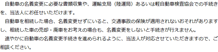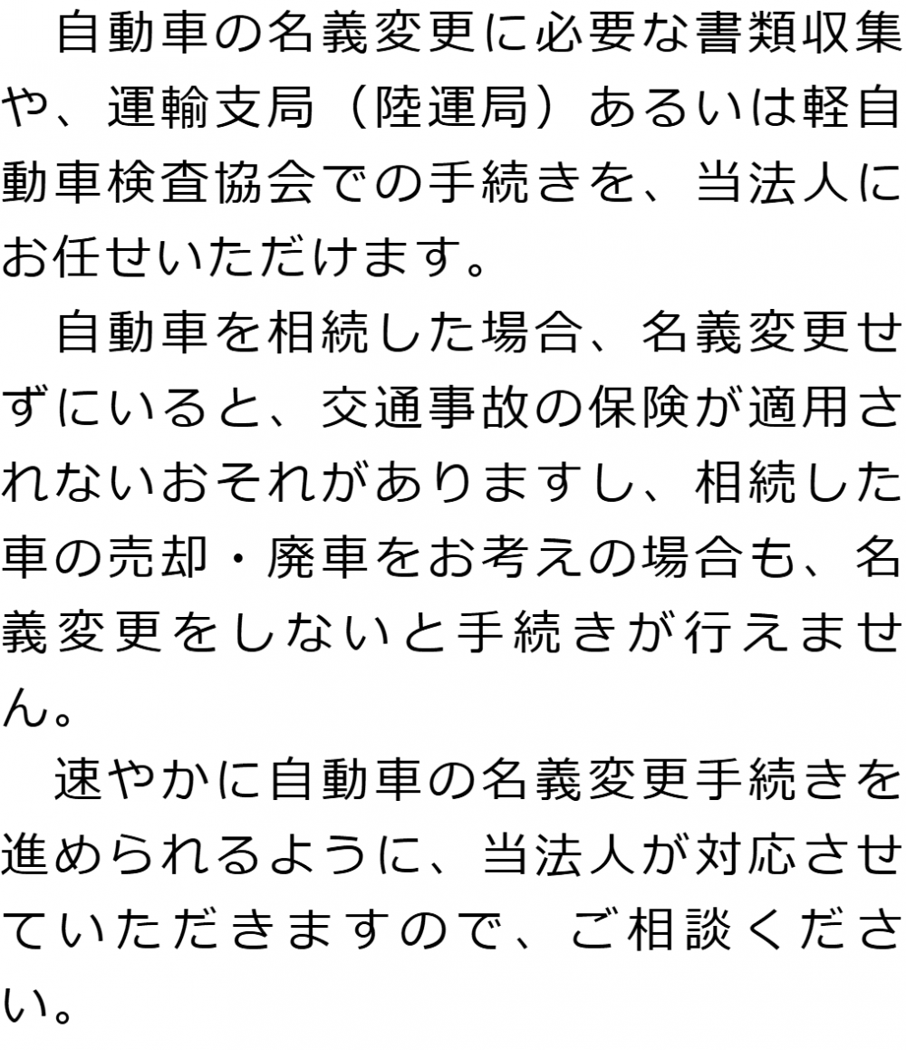 トップ業務内容自動車の名義変更 階層構造▼ 業務内容(目次) 自動車の名義変更 業務内容(目次)業務内容トップ行政書士法人心の業務内容遺言遺産整理相続人調査相続財産調査遺産分割協議書の作成預金・貯金の解約・名義変更証券口座の解約・名義変更自動車の名義変更心グループのその他の業務内容家族信託・民事信託節税対策事業承継遺言の検認相続放棄限定承認遺産分割遺留分侵害額請求相続登記相続税申告相続税調査 受付時間 平日 9時~21時、土日祝 9時~18時 夜間・土日祝の相談も対応します (要予約) 所在地 〒192-0046 東京都八王子市明神町4-7-3やまとビル3F 0120-2403-39 お問合せ・アクセス・地図
