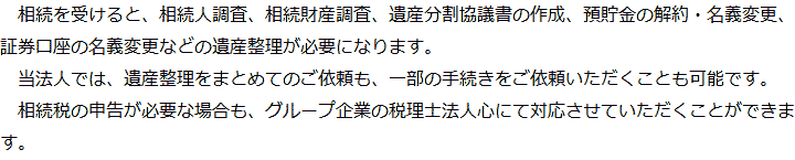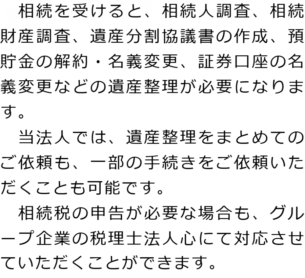 トップ業務内容遺産整理 階層構造▼ 業務内容(目次) 遺産整理 業務内容(目次)業務内容トップ行政書士法人心の業務内容遺言遺産整理相続人調査相続財産調査遺産分割協議書の作成預金・貯金の解約・名義変更証券口座の解約・名義変更自動車の名義変更心グループのその他の業務内容家族信託・民事信託節税対策事業承継遺言の検認相続放棄限定承認遺産分割遺留分侵害額請求相続登記相続税申告相続税調査 受付時間 平日 9時~21時、土日祝 9時~18時 夜間・土日祝の相談も対応します (要予約) 所在地 〒192-0046 東京都八王子市明神町4-7-3やまとビル3F 0120-2403-39 お問合せ・アクセス・地図