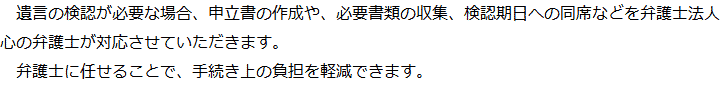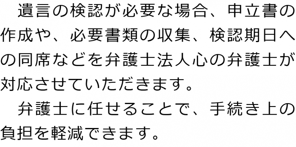 トップ業務内容遺言の検認 階層構造▼ 業務内容(目次) 遺言の検認 業務内容(目次)業務内容トップ行政書士法人心の業務内容遺言遺産整理相続人調査相続財産調査遺産分割協議書の作成預金・貯金の解約・名義変更証券口座の解約・名義変更自動車の名義変更心グループのその他の業務内容家族信託・民事信託節税対策事業承継遺言の検認相続放棄限定承認遺産分割遺留分侵害額請求相続登記相続税申告相続税調査 受付時間 平日 9時~21時、土日祝 9時~18時 夜間・土日祝の相談も対応します (要予約) 所在地 〒192-0046 東京都八王子市明神町4-7-3やまとビル3F 0120-2403-39 お問合せ・アクセス・地図