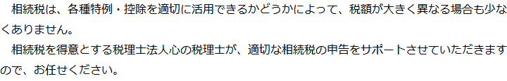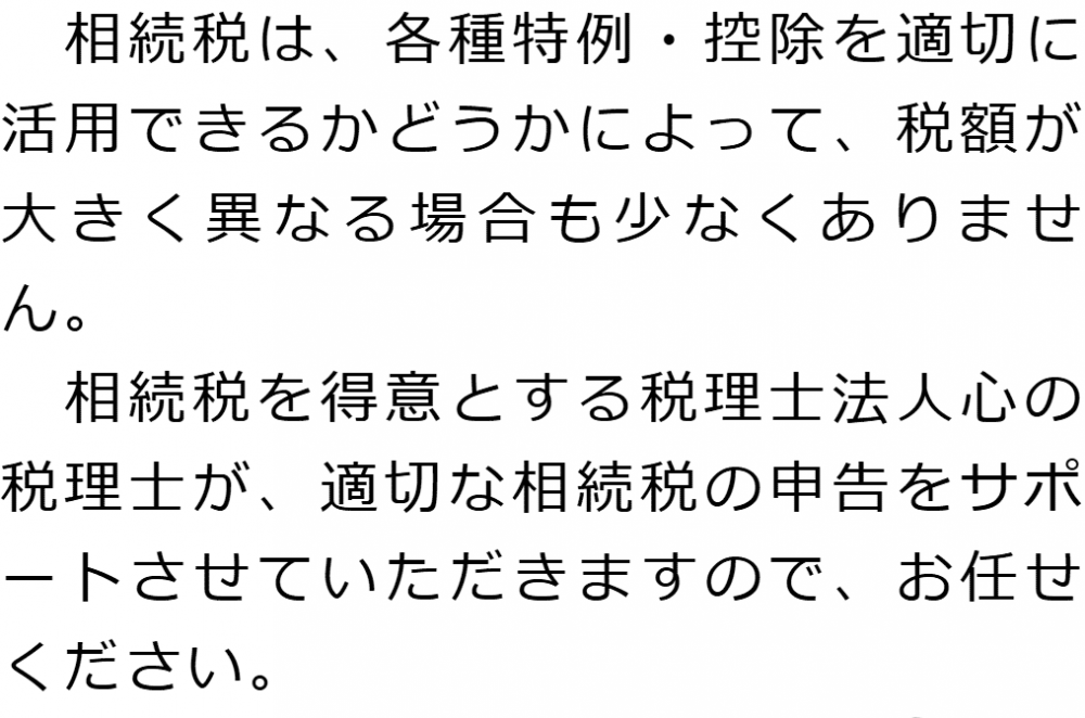 トップ業務内容相続税申告 階層構造▼ 業務内容(目次) 相続税申告 業務内容(目次)業務内容トップ行政書士法人心の業務内容遺言遺産整理相続人調査相続財産調査遺産分割協議書の作成預金・貯金の解約・名義変更証券口座の解約・名義変更自動車の名義変更心グループのその他の業務内容家族信託・民事信託節税対策事業承継遺言の検認相続放棄限定承認遺産分割遺留分侵害額請求相続登記相続税申告相続税調査 受付時間 平日 9時~21時、土日祝 9時~18時 夜間・土日祝の相談も対応します (要予約) 所在地 〒192-0046 東京都八王子市明神町4-7-3やまとビル3F 0120-2403-39 お問合せ・アクセス・地図