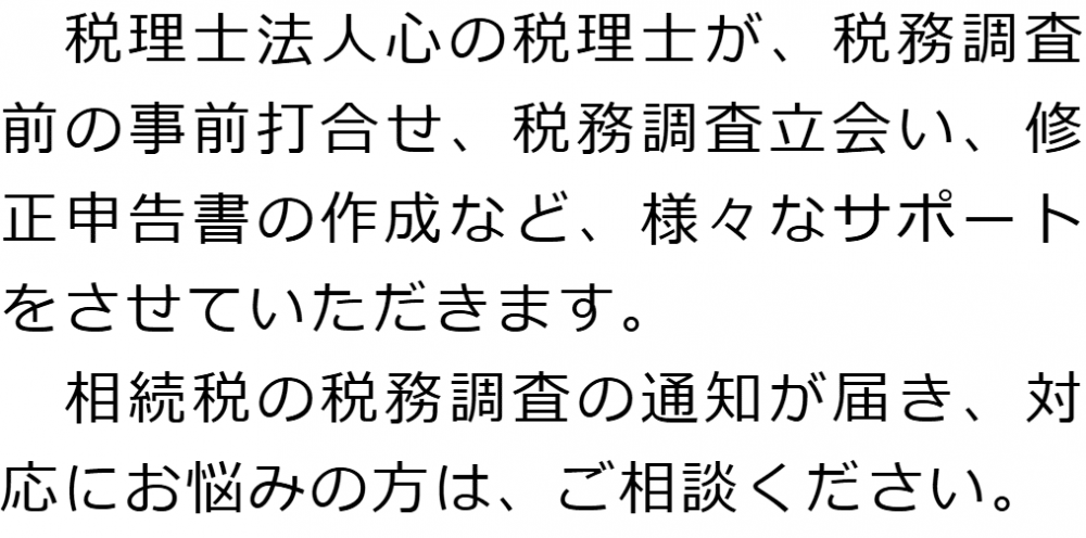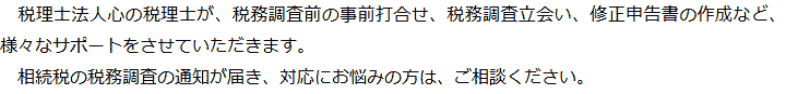 トップ業務内容相続税調査 階層構造▼ 業務内容(目次) 相続税調査 業務内容(目次)業務内容トップ行政書士法人心の業務内容遺言遺産整理相続人調査相続財産調査遺産分割協議書の作成預金・貯金の解約・名義変更証券口座の解約・名義変更自動車の名義変更心グループのその他の業務内容家族信託・民事信託節税対策事業承継遺言の検認相続放棄限定承認遺産分割遺留分侵害額請求相続登記相続税申告相続税調査 受付時間 平日 9時~21時、土日祝 9時~18時 夜間・土日祝の相談も対応します (要予約) 所在地 〒192-0046 東京都八王子市明神町4-7-3やまとビル3F 0120-2403-39 お問合せ・アクセス・地図